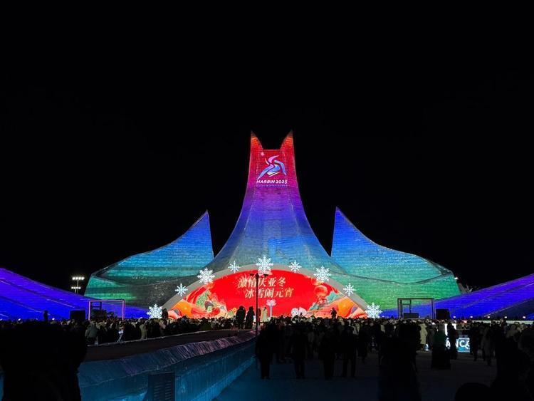 r“虽然很冷,但是很美,白天冰雕晶莹剔透,夜幕降临,梦幻光影点亮冬夜,太不可思议了!”在“嗨翻天”的冰雪大世界里,泰国游客甘艳玲随着人群在雪地里蹦迪、放声唱歌。作为亚冬会开幕式分会场,这里将45个亚奥理事会成员的地标建筑均以冰建形式呈现。