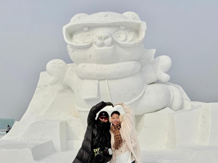 两名游客在哈尔滨冰雪大世界内的亚冬会吉祥物雪雕前拍照。新华社记者 杨思琪 摄